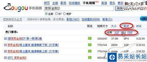 當我們輸入相應關鍵字來查找手機視頻后,可以看到如圖3所示窗口,還能選擇相應的格式,如MP4、3GP、PMP等,進一步細化,以便找到適合自己手機的視頻。