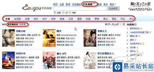 現在很多人的手機都擁有較強的播放能力和較大的存儲能力,但是手機中播放的視頻格式與電腦上的并不相同,要找到更多的電影裝到手機中娛樂還需要費一些周折。當然,迅雷狗狗也為我們提供了手機視頻搜索頻道,可以很好地滿足我們的需要。打開http://www.gougou.com,單擊 “手機視頻”標簽(如圖2,也可以直接打開http://shouji.gougou.com/),其下有全部、電視劇、動漫、綜藝、動作、戰爭、劇情、記錄、喜劇、動畫、愛情、懸念、冒險、科幻、其它等視頻類型,也可以按更新時間或按熱度來排序,右側還有“本周熱門”排行列表,直接單擊就可以搜索、下載。