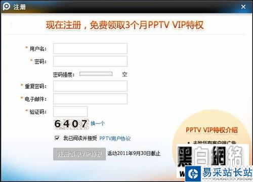 圖:PPTV 免費領取3個月VIP特權會員注冊頁面