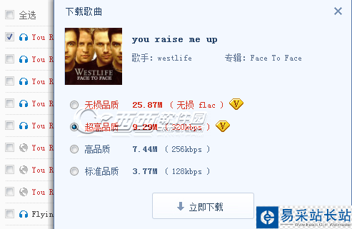 4、勾選一個搜索結果,點擊后面的下載按鈕,選擇想要下載的歌曲品質,超高品質與無損品質是需要充值會員的,一般高品質的音樂就夠了。