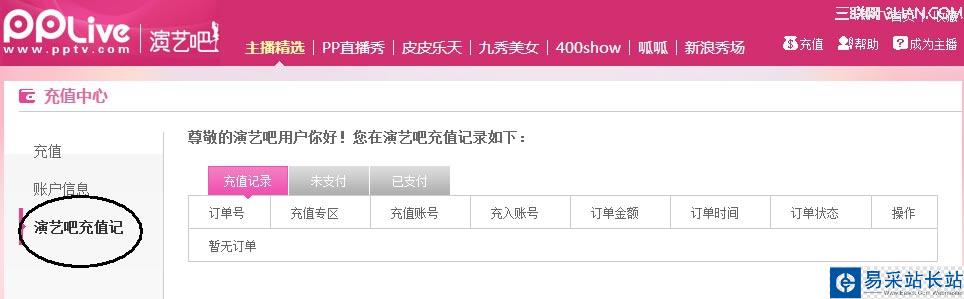 步驟1:從PPlive演藝吧首頁,一級導航欄【充值】進入;