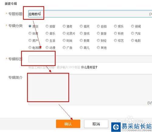 要上傳視頻,首先要新建一個(gè)視頻專輯,點(diǎn)擊右上角“新建專輯”按鈕。輸入專輯標(biāo)題,勾選專輯分類,填寫專輯標(biāo)簽,輸入專輯介紹,最后點(diǎn)擊“確認(rèn)”按鈕即可創(chuàng)建成功。