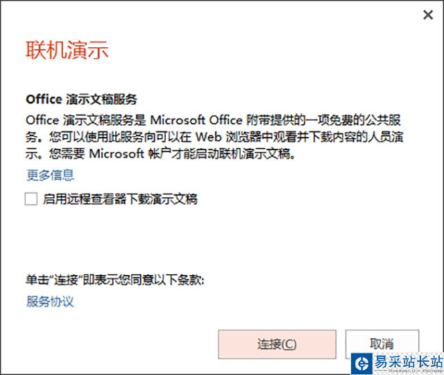 最左側的放映欄大家應該再熟悉不過了,從頭開始依舊是經典的“F5”,沒有太多出奇。但是不得不提一下聯機演示這個功能。這對異地或者多地PPT演示有極大的幫助,接受協議就會彈出一個URL,將URL分享給任何能聯網的設備,通過瀏覽器就可以實現在一臺PC上放映,多臺設備同時觀看的功能,非常實用!