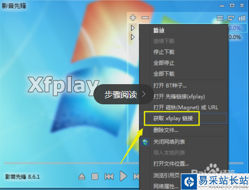 從打開的播放列表中右擊要下載的視頻文件,從彈出的擴(kuò)展面板中選擇”獲取xfplay磁鏈“項(xiàng)。