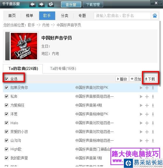 然后,點“中國好聲音學員”,會顯示出中國好聲音的所有歌曲,一共8頁,在每頁全選,然后點右上方的“下載”。