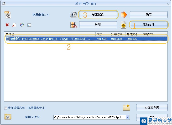 2 在所有轉到MP4界面中點擊“添加文件”添加您需要轉換的影片,您所添加的視頻文件就顯示在(2)處,點擊“輸出配置”對視頻進行設置