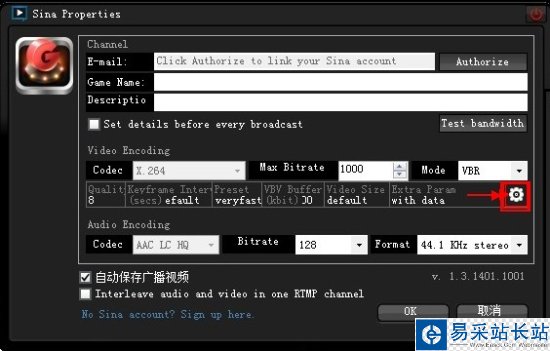 5. 在 廣播 -> 編輯頻道 Sina Properties 中可對頻道的畫質進行詳細設置,在Sina 插件設置頁面,首先請點Authorize登陸新浪看游戲帳號,如果沒有注冊新浪帳號,請點 No Sina accout ? Sign up here. 進入注冊帳號頁面。注意:請添寫游戲名稱Game Name: 和游戲說明:Descriptio 兩項!