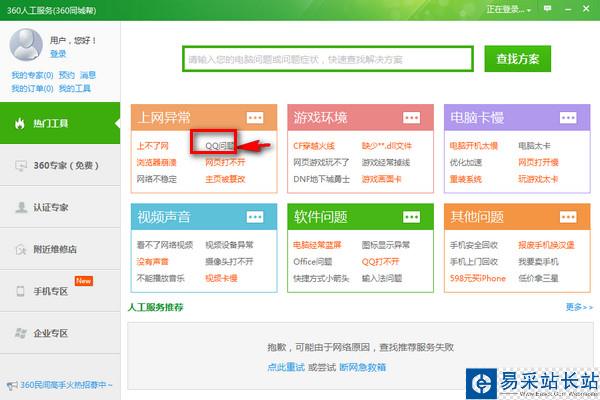 3、利用360等安全衛士進行問題修復,打開安全衛士界面,點擊菜單欄上的人工服務、找到QQ問題、找到qq相關產品無法登陸選項,點擊立即修復。修復完成后,重新打開QQ音樂,應該就可以了