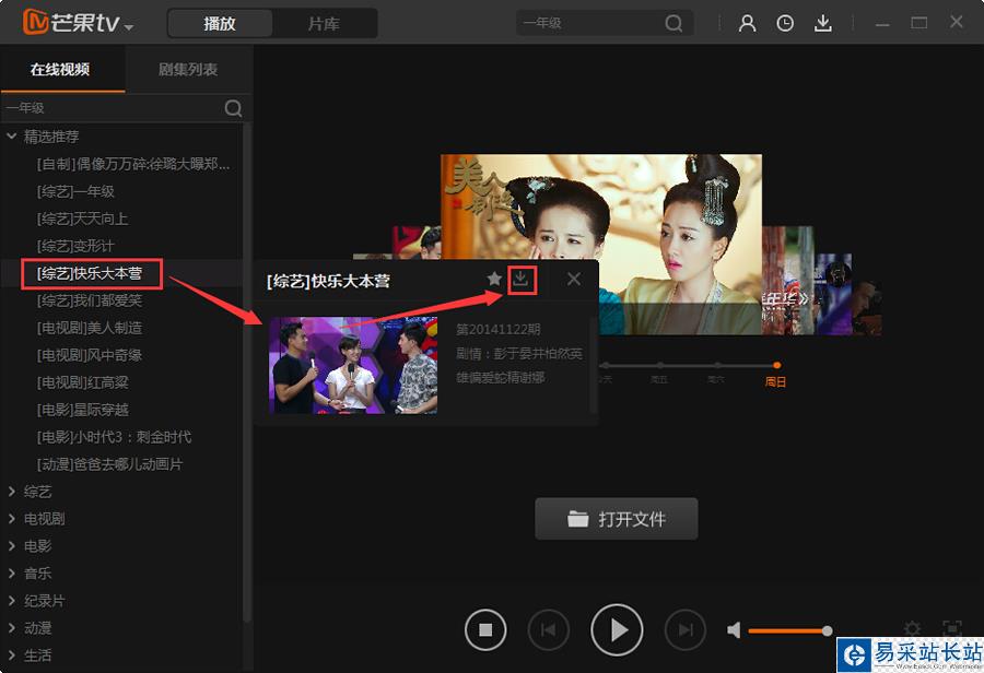 1.在錯新站長站下載安裝芒果tv客戶端最新版,打開后選擇要下載的視頻,小編以快樂大本營為例。鼠標點擊后右邊會彈出一個框,然后再點星星右邊的下載按鈕。