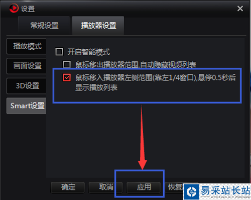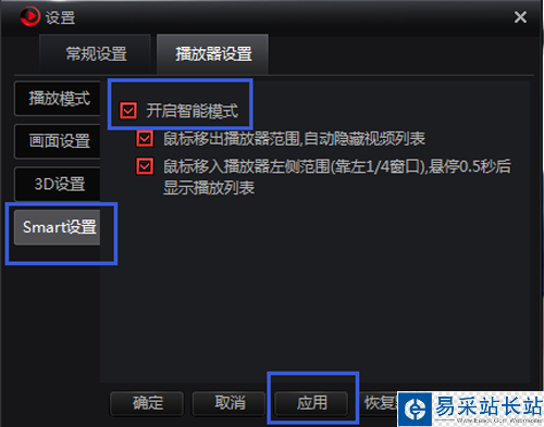 3、可以選擇是否開啟智能模式,鼠標移出播放器范圍,是否自動隱藏視頻列表,鼠標移入播放器左側(cè)范圍(靠左1/4窗口),懸停0.5秒后是否顯示播放列表,設(shè)置之后,點擊“應(yīng)用”或者“確定”按鈕保存,點擊“恢復(fù)默認”按鈕則可恢復(fù)到默認設(shè)置。