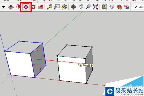 5、選中“移動(dòng)”工具,先在鍵盤上按住“Ctrl+M”,然后左鍵單機(jī)正方形組件,松開鍵盤按鍵,鼠標(biāo)沿一個(gè)方向移動(dòng),輸入2m,得到另一個(gè)正方體。