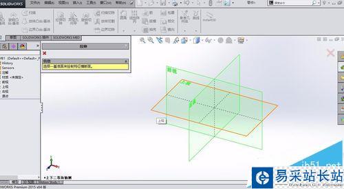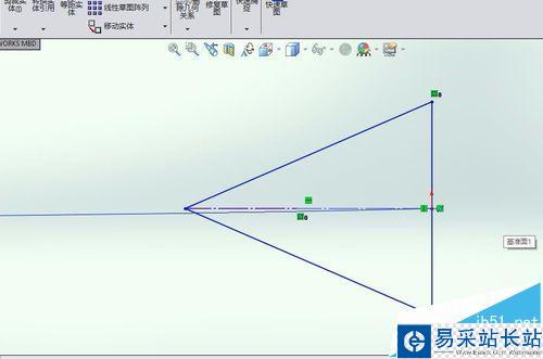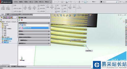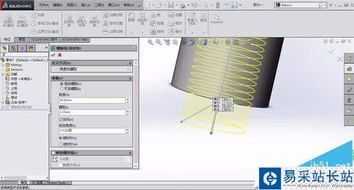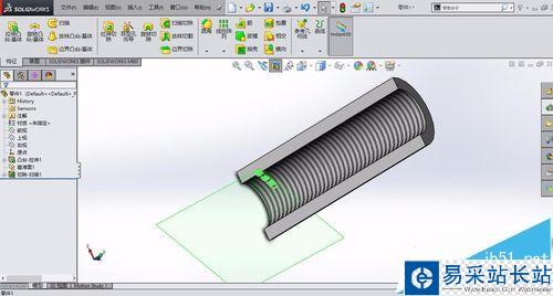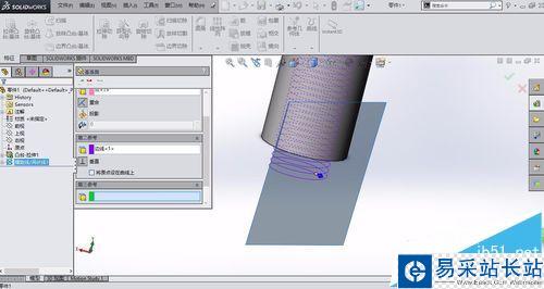 5、在基準面上,繪制三角形或者等腰梯形,為螺紋的形狀。繪制完畢退出草圖,然后點擊掃描切除,輪廓為三角形,路徑為螺旋線。