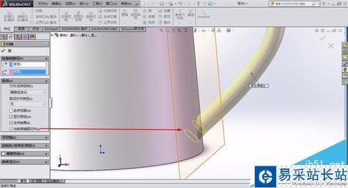 7、我們可以將基準面1隱藏,然后點擊掃面,掃描的輪廓為基準面所繪制的圓,路徑為樣條曲線,掃描的時候在選項中選取與結束面對齊。