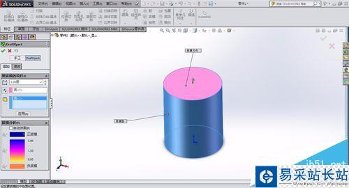 3、點擊特征中的拔模,拔模角度設置為3°,拔模的方向選取為圓柱的上表面,要拔模的面為圓柱的外表面,點擊確定完成拔模的創建。