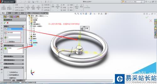 4、選擇圓形陣列,選取剛剛的掃描特征為陣列特征,選擇等距陣列,中心線為陣列軸,最后結果如圖