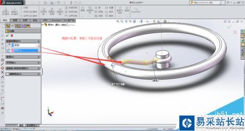 3、在剛創建的基準平面上繪制輪輻截面輪廓,繪制完成點擊掃描命令,對輪輻輪廓進行掃描,選取先前繪制的曲線為引導線,操作如圖