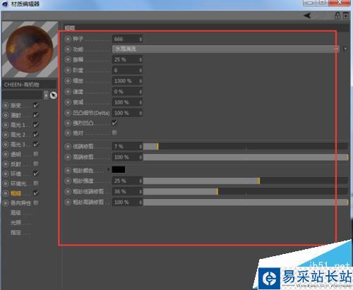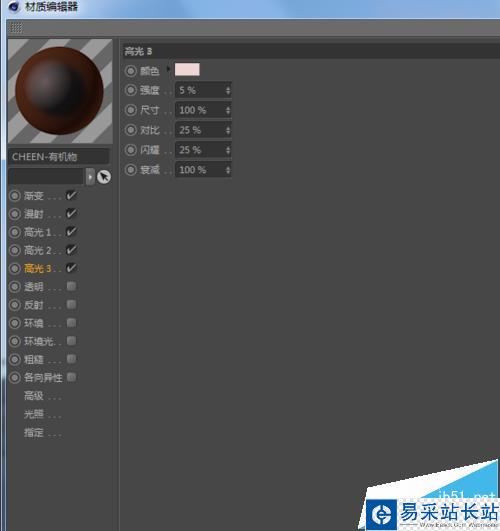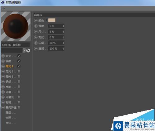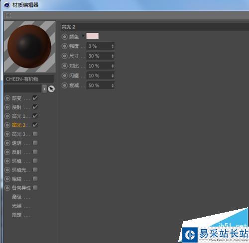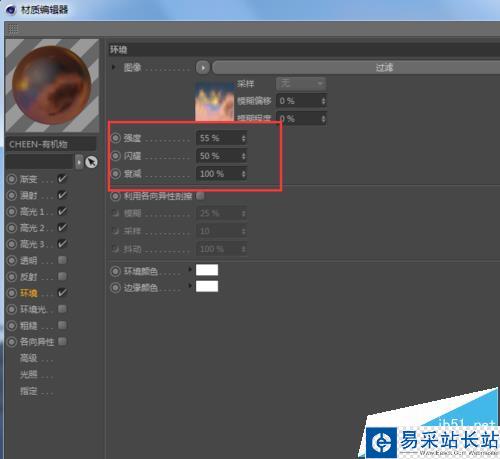 5、打開材質,我們對其做進一步的調整,具體的參數可以參看下面的截圖,在環(huán)境中要選擇一個比較合適的圖片賦予環(huán)境(參數只做參考,可以適當的修改得到更好的效果)。