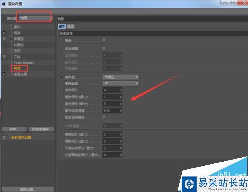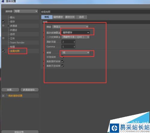 6、材質調整完之后,我們對渲染做一下設置,這里選擇物理渲染器,然后打開全局光照,采樣設置成低就可以了,這樣可以加快渲染。