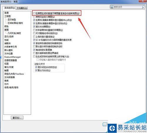 3、勾選(減選)第一項(xiàng)“在草圖生成時(shí)垂直于草圖基準(zhǔn)面自動(dòng)旋轉(zhuǎn)視圖”左邊的復(fù)選框,即可啟用(關(guān)閉)自動(dòng)正視于所選草圖基準(zhǔn)面這一功能,如下圖所示: