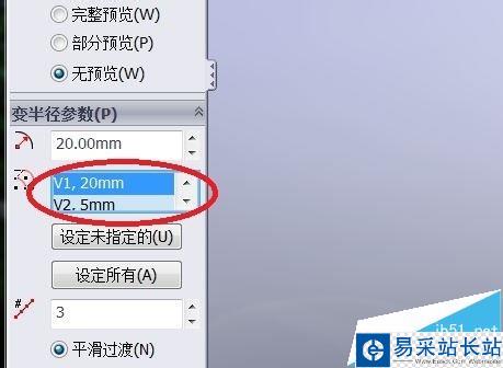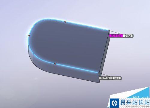 7、變半徑 繪制圓角。分別輸入選中邊兩端的需要設置圓角的半徑值V1和V2