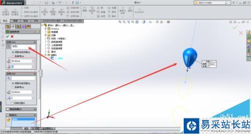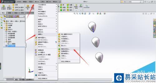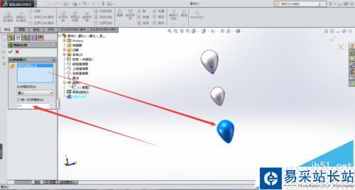 2、選擇旋轉(zhuǎn)基體命令生成一個水滴特征。再選擇線性陣列,將水滴沿中心線向下陣列兩個,具體操作如圖所示。