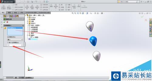 3、接著點(diǎn)擊插入/模具/縮放比例,選擇中間的小水滴,綻放比例為0.8。同樣的方法將下面的水滴縮放比例為0.7