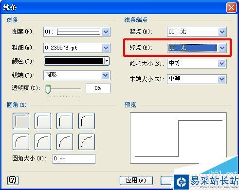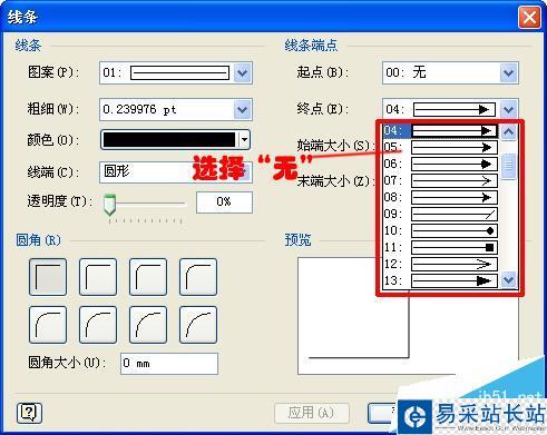 7、點擊“終點”旁邊的下拉箭頭,在彈出的線條種類中選擇“無”(在進度條最上端),如下圖所示;