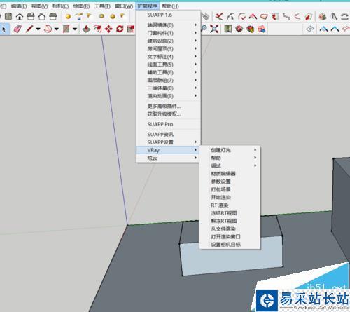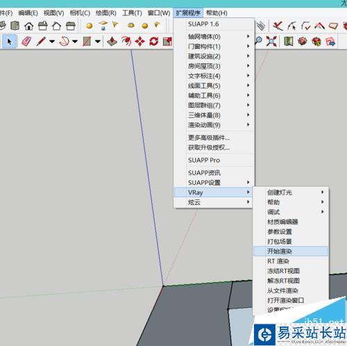 1、在安裝好vary插件的電腦上打開su模型選擇好角度。點擊上方的擴展程序。