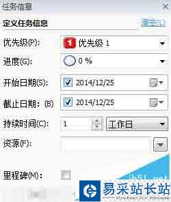 4、選中主題,點擊【任務(wù)】欄中的“隱藏任務(wù)面板”,在右側(cè)生成任務(wù)信息,在這里你可以對你的任務(wù)進行優(yōu)先設(shè)置,進度設(shè)置,時間設(shè)置(起止日期,持續(xù)時間)。或者可以直接在甘特圖中點擊,拖拽時間條進行更改。