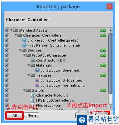 4、緊接著彈出了一個窗口,我們新不管他里面有什么,先點擊ALL(如何不點他的話,unity3d可能會自己報錯<小編就有過>),然后再點擊Import導出包。