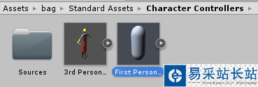 2、我們先不理Editor文件夾,進入Standard Assets->Character Controllers->First Person Controller (然后就看到這個:“First Person Controller”是一個膠囊,其實他就是第一人稱視角控制器)