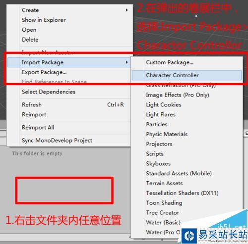 3、雙擊進入文件夾,然后右鍵點擊文件夾內(nèi)任意位置彈出卷展欄,然后點擊:Import Package -> Charactor Controllor (即導入“角色控制包”)