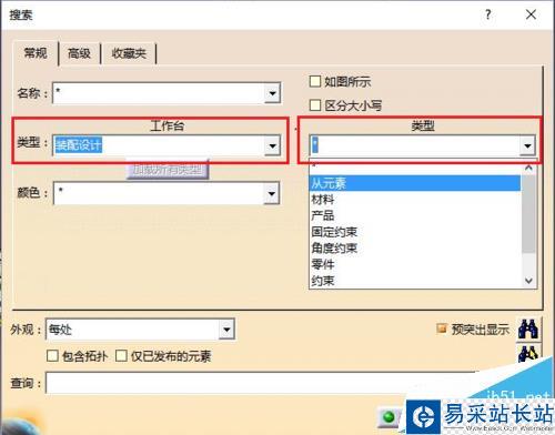 2、在彈出的“搜索”對(duì)話框窗口中,“工作臺(tái)”下方的類(lèi)型選擇“裝配設(shè)計(jì)”,在右邊的“類(lèi)型”中選擇“從元素”,將彈出“停止捕獲”對(duì)話框窗口。
