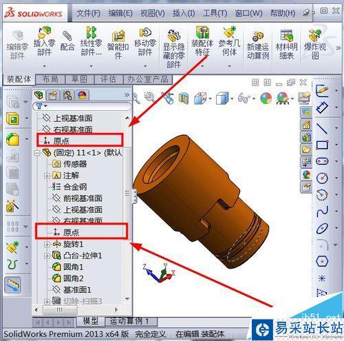 7、現(xiàn)在準(zhǔn)備查看零件原點(diǎn)與中標(biāo)原點(diǎn)是否重合,展開零件特征,點(diǎn)擊裝配體默認(rèn)原點(diǎn),再點(diǎn)擊零件原點(diǎn),如圖所示