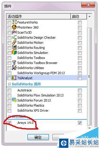5workbench設(shè)置已經(jīng)完成,下面查看與solidworks插件是否連接上?打開solidworks插件,如下圖,“Ansys 14.0”插件已經(jīng)出現(xiàn),勾選此插件。