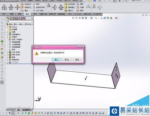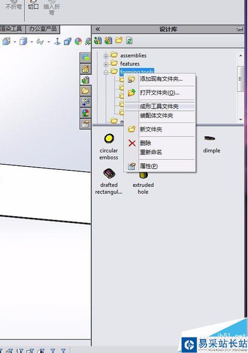 2、在右側的任務欄點擊【設計庫】,找到【forming tools】的文件夾,里面都是一些常用的成型工具。此時拖動添加到鈑金文件提示建立派生零件。