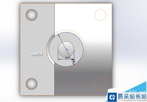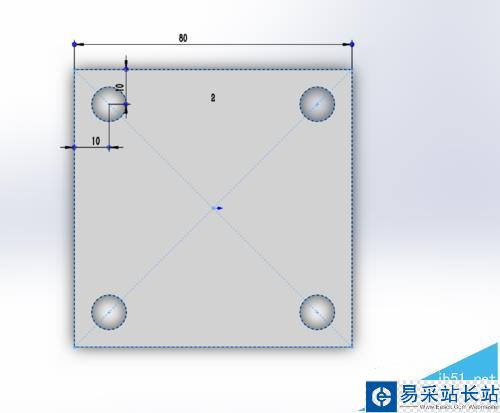 2、然后點擊草圖框的草圖繪制,繪制一個底座的視圖。尺寸可以自己定,小編尺寸為:外部80正方形,四個圓心是60正方形,圓直徑10