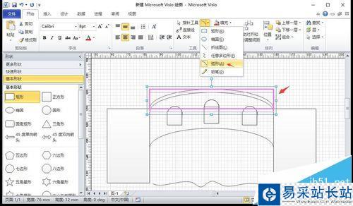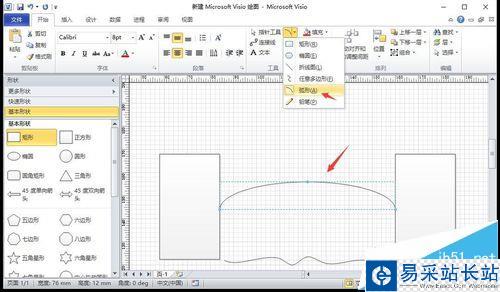 3、在兩個矩形之間,用“弧形工具”繪制一個橋底邊,如圖所示。