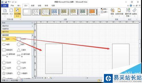 2、接著,從左側形狀欄中拖入兩個矩形作為河岸橋的基石,如圖所示。