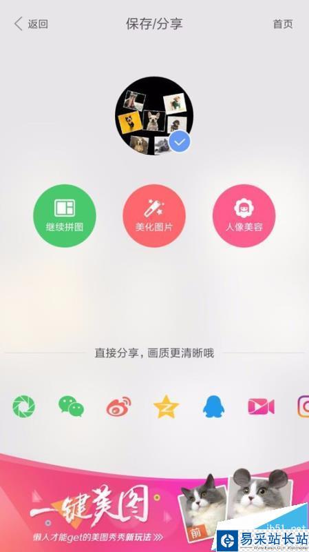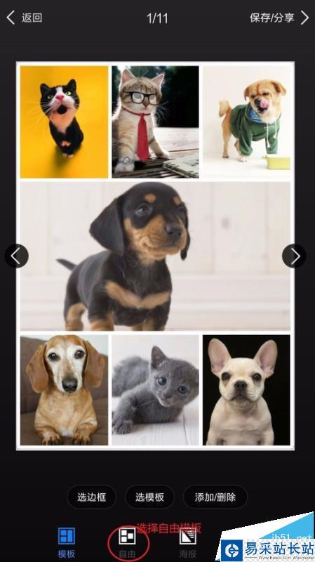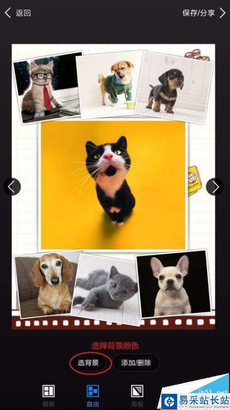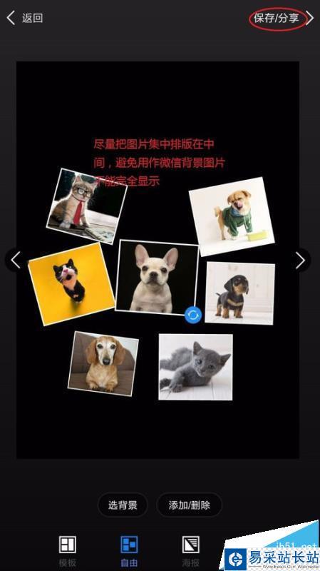 3、根據(jù)自己的喜愛,開始制作圖片(選擇模板→選擇背景顏色→調(diào)整圖片大小及排版),完成后點(diǎn)保存