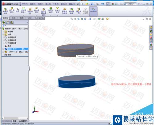 4、選中零件1,按住Ctrl件拖動(dòng),可以實(shí)現(xiàn)復(fù)制零件的功能。給新復(fù)制的零件添加約束,與零件1同軸心。