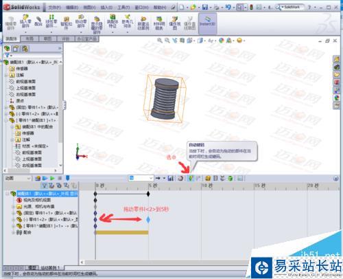 8、拖動(dòng)零件1<2>的控制柄到五秒的位置,拖動(dòng)模型中的 零件1<2>一段距離,點(diǎn)擊 計(jì)算。就可以生成動(dòng)畫效果了。