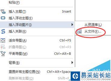 1、右擊導圖背景,點擊插入浮動圖片,然后點擊從文件;或者點擊導圖背景,在插入選項卡上主題元素組里,點擊圖片箭頭, 選擇從文件插入圖片,再點擊要創建浮動圖像的位置。