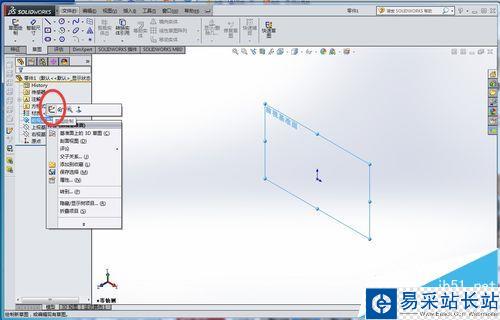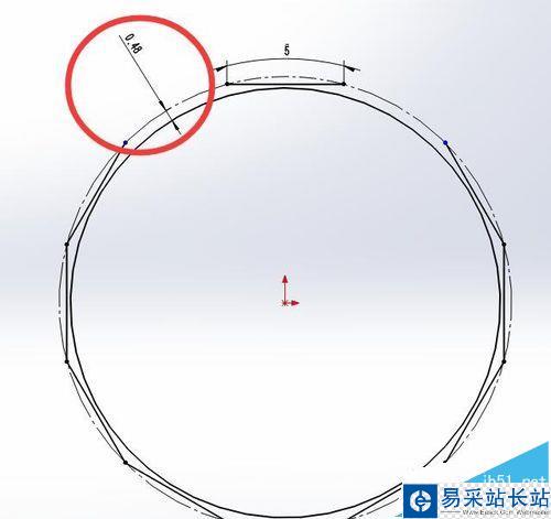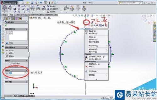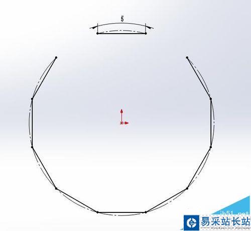 3、畫一條中心線,選擇最上面一條邊使之平行,裁剪草圖兩邊,設(shè)定弧長5