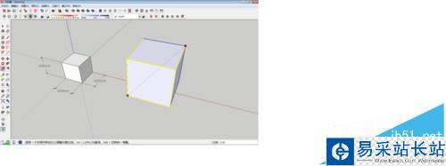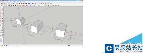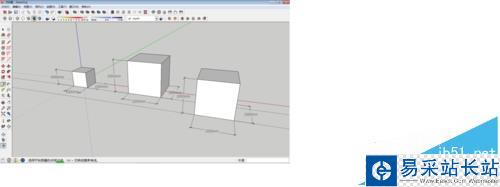 做為參照物,通過(guò)比較方便發(fā)現(xiàn)其中的變化(并標(biāo)注相應(yīng)的尺寸);選中立方體,移動(dòng)(M)+ctrl,復(fù)制一份(本教程復(fù)制的立方體放大系數(shù)都為2倍);選中復(fù)制的立方體,點(diǎn)擊縮放工具(S),會(huì)出現(xiàn)綠色的點(diǎn)(如圖左起第二個(gè))。