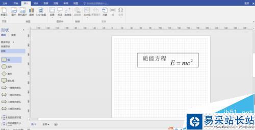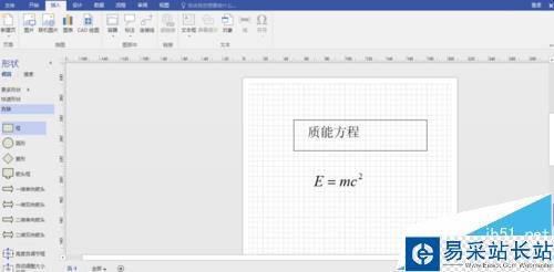 2、在這里我們大概講一下怎么將公式和文本框放在同一個(gè)方框里面,這也是我們經(jīng)常要用的步驟。依次點(diǎn)擊“更多形狀”--“常規(guī)”--“方塊”,添加一個(gè)矩形框到畫布上,然后加一個(gè)文本框,輸入“質(zhì)能方程”。
