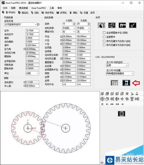 3、如圖,對各種參數(shù)進(jìn)行設(shè)置后,點(diǎn)擊紅色箭頭處按鈕,即可在Solidworks中自動(dòng)生成模型。