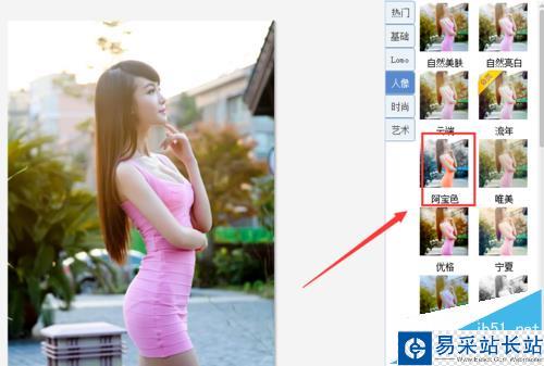 7、點擊阿寶色選項后,我們的圖片添加該效果,可以看到我們的照片美女的衣服顏色由粉色變成了橘色,如圖所示: