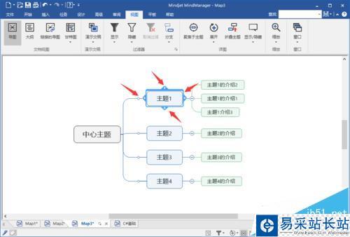 4、子主題的編輯:子主題的編輯跟中心主題類似也可以添加其子主題,單擊該主題然后點(diǎn)擊該主題的左右兩邊的“+”號(hào)即可,在單擊該主題時(shí)還會(huì)看到上下兩個(gè)“+”號(hào),分別表示在其上面或下面添加同等級(jí)主題,如下圖所示: