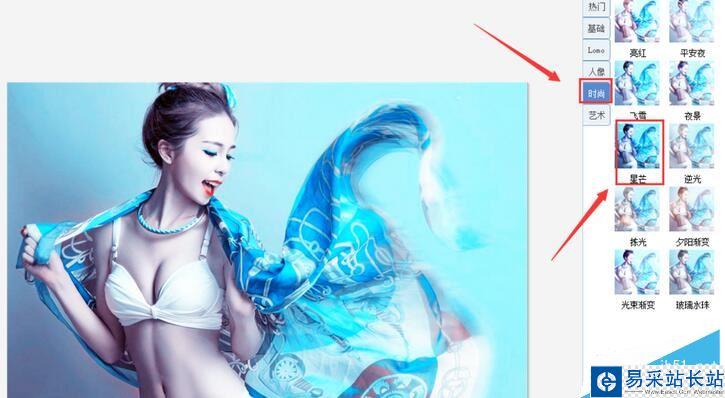 在編輯界面內找到時尚選項,并在時尚選項的選擇區域里找到星芒選項,如圖所示: